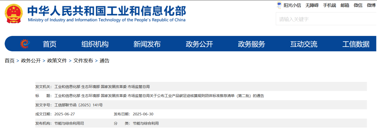 • 2025-08-06 工業和信息化部等四部門關于公布工業產品碳足跡核算規則團體標準推薦清單(第二批)的通告